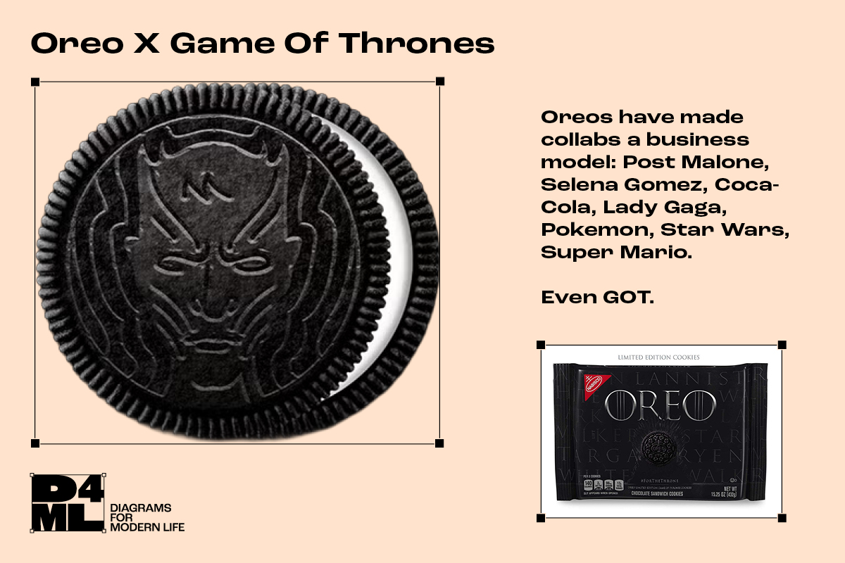 Oreos have made collabs a business model: Post Malone, Selena Gomez, Coca-Cola, Lady Gaga, Pokemon, Star Wars, Super Mario. Most are 'us + latest thing' and work modestly. But the Game of Thrones edition, with embossed House sigils, was genuinely brilliant. Totally unexpected. Looked great. People collected the packaging.